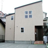 玄関ドア廻りの板貼りと正面四つ窓がお洒落ポイント。