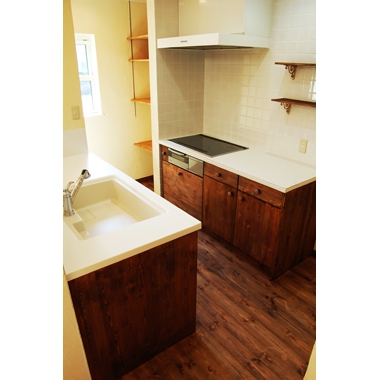 照明・取っ手のみならず、木製二の字型キッチンのオリジナル性も魅力的。