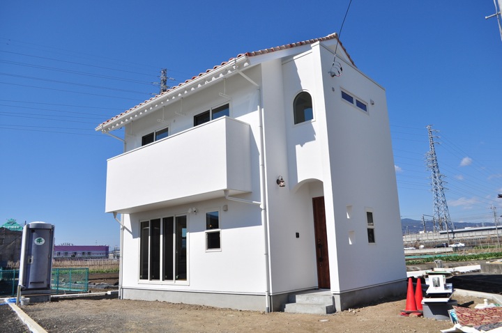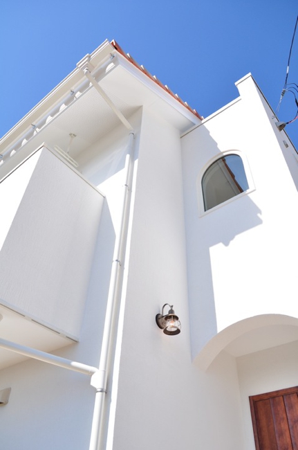 外観はホワイトランダム瓦に真っ白な塗壁仕上げ。