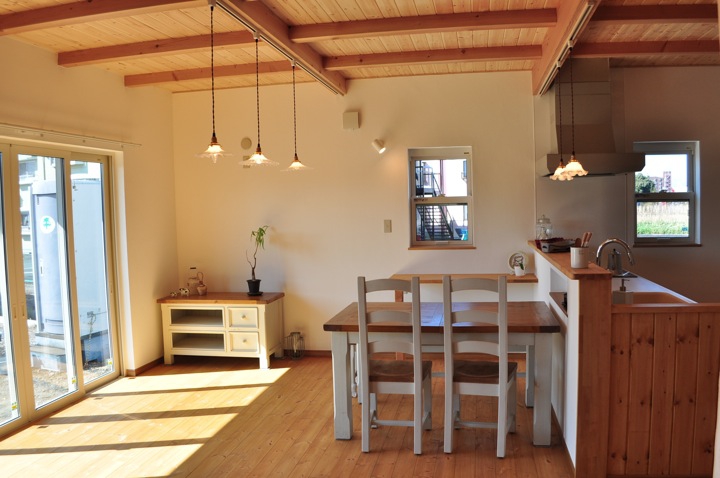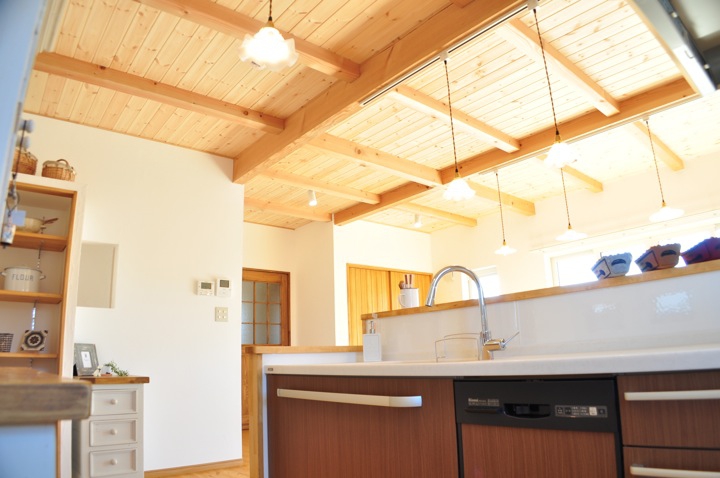 1階LDKは、梁現しの羽目板仕上げ。天井が高く開放的です。