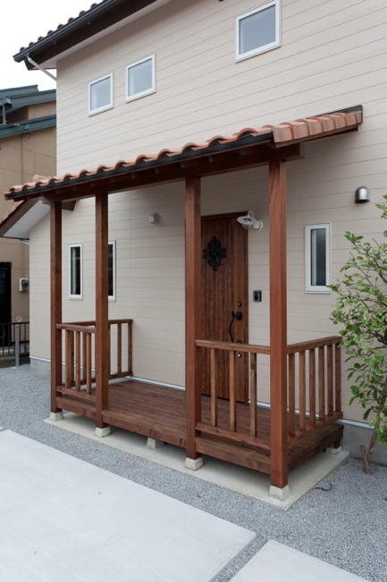 外観では北にある玄関アプローチに温かみのある木を使ってデッキを組み、北玄関の暗いイメージを