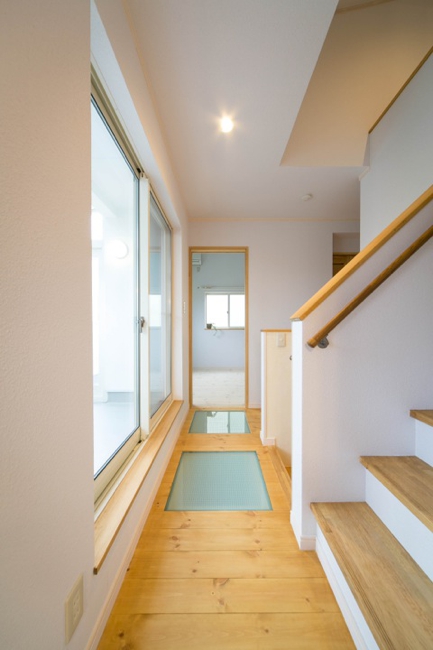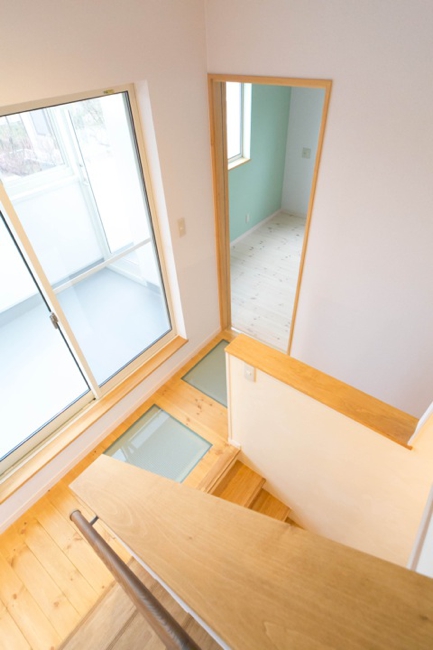 2階廊下には1階廊下を明かり取りの床埋込ガラスと