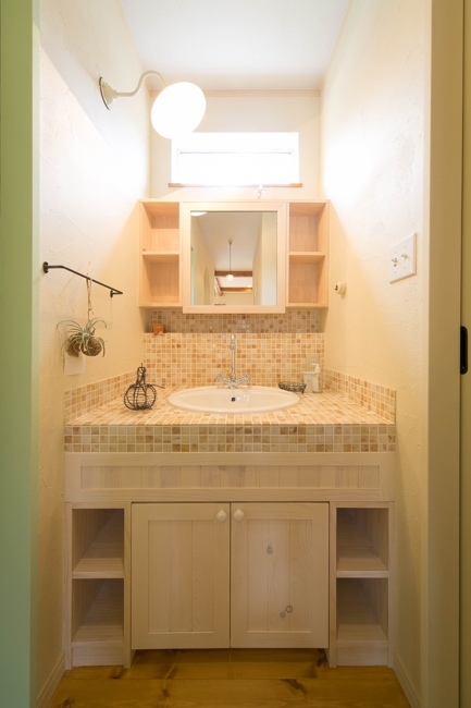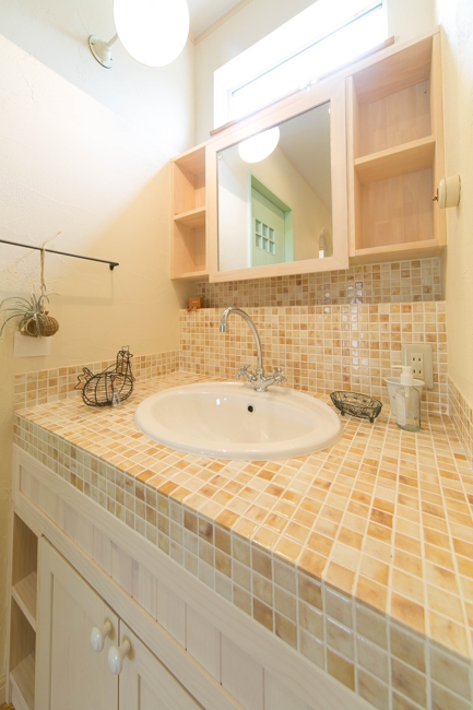 [キッチン]木製オリジナル [洗面]木製扉+タイル張天板 他オリジナル