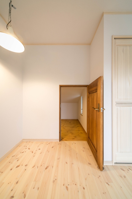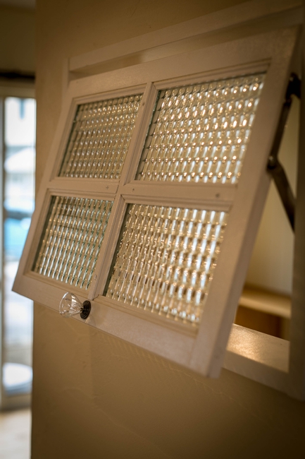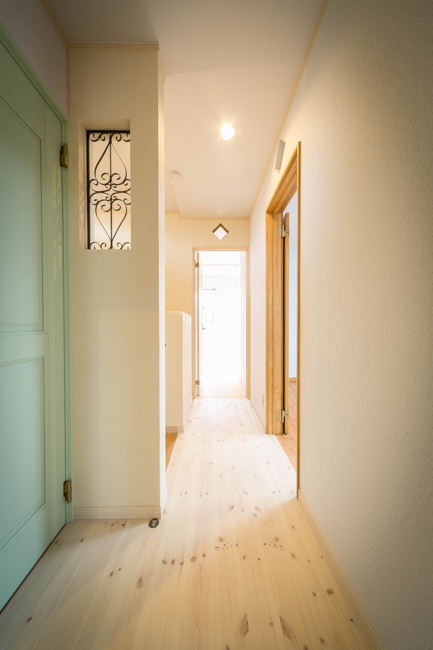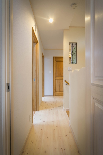 2階各部屋のドア上壁には明り取りも兼ねたデザインガラスや