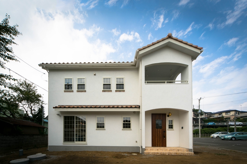 真っ白の塗り壁の外壁、2色配合させたランダム屋根瓦、
