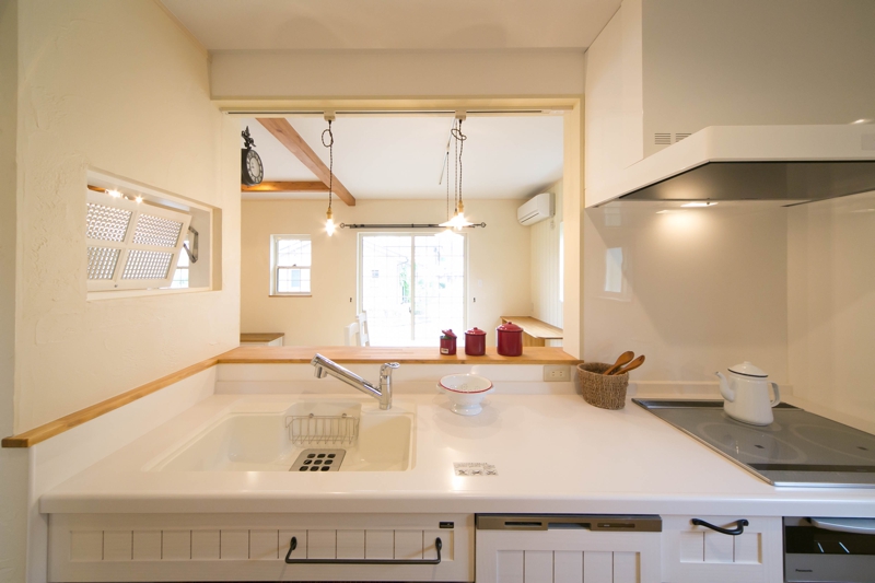 アンティーク調鎧戸と窓下のレンガ貼りなど、内外装共