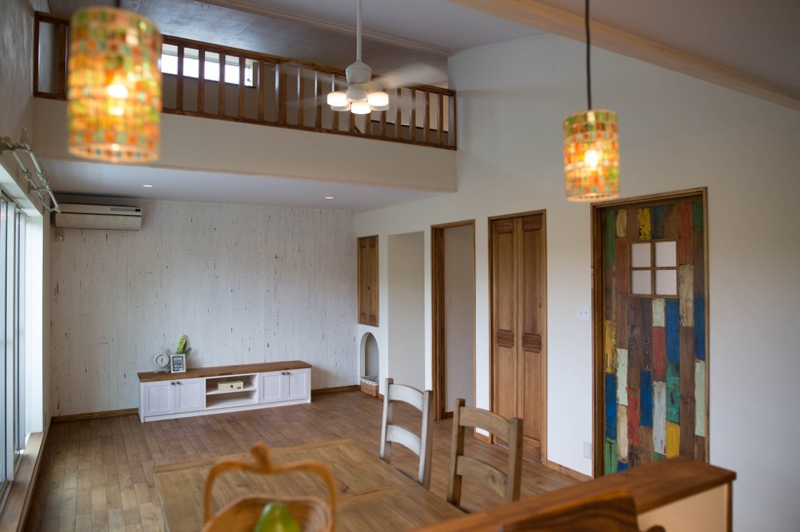 造作で扉付食器棚も設けました。リビ ング勾配天井の開放感と