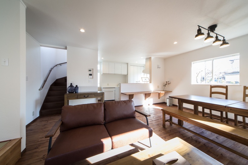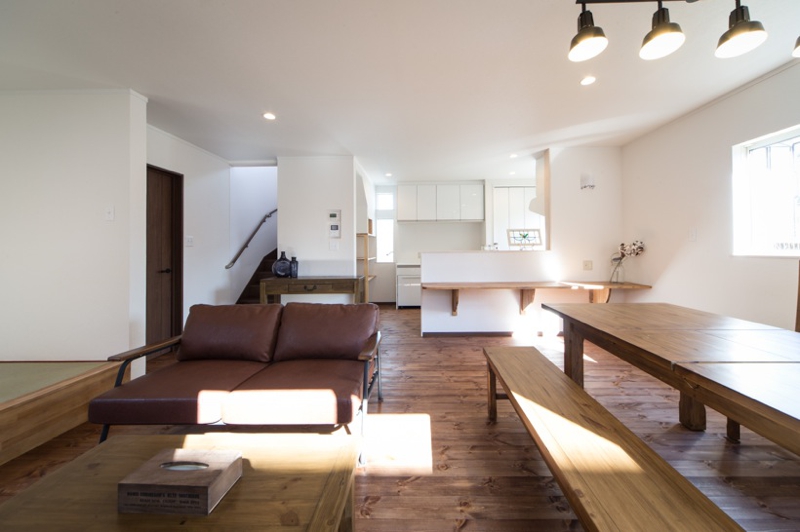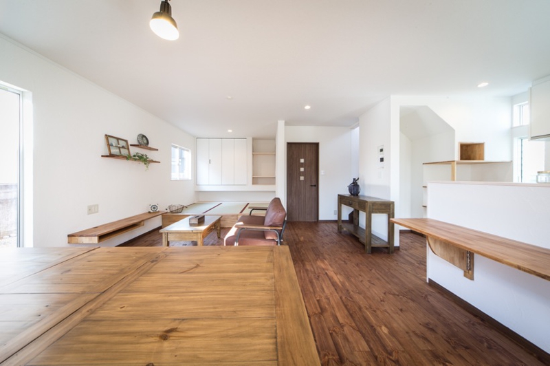 室内はというと、多数の友人を招いても まだゆとりのある広いLDKは小上床下収納付4.5帖タタミスペースもありとても開放的です。