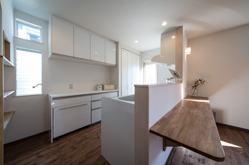 キッチンはピアノ塗装の扉にキッチン収納棚や造作収納で大容量。全室、天然木のフローリングなので木の香りが漂い落ち着いた