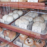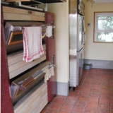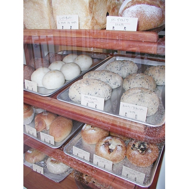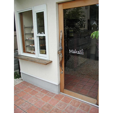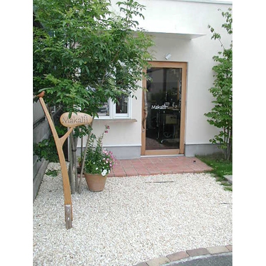 アプローチから店内につながる床はすべてスペインタイル200角。ヨーロッパのパン屋さんをイメージしました。外壁は粒の粗い石が入った塗り壁です。内壁はアメリカ製の鉛の入っていない環境にもやさしい塗料でドライウォール仕上げになっています。入口ドアの取っ手は流木を流用してみました。