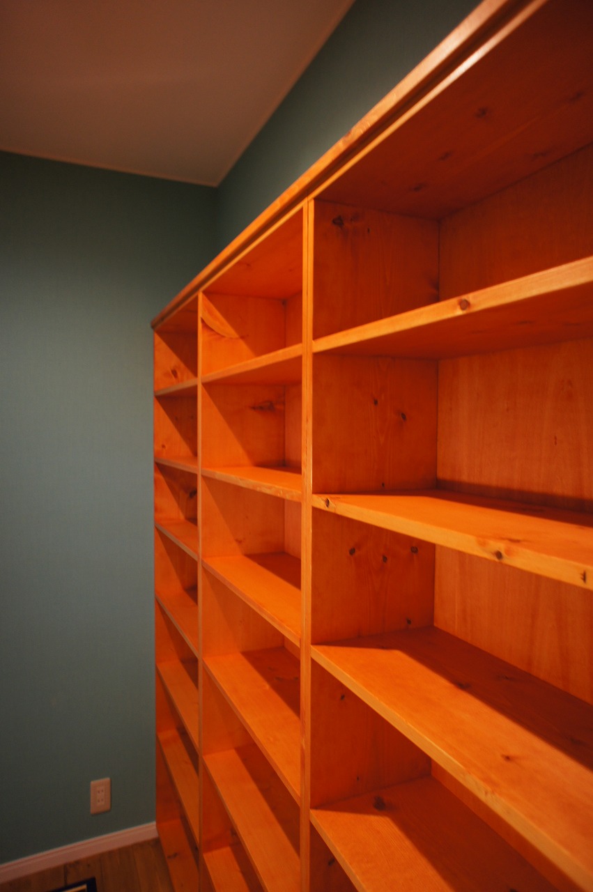 書斎には、ブラジルカラーで塗装された無垢板本棚、