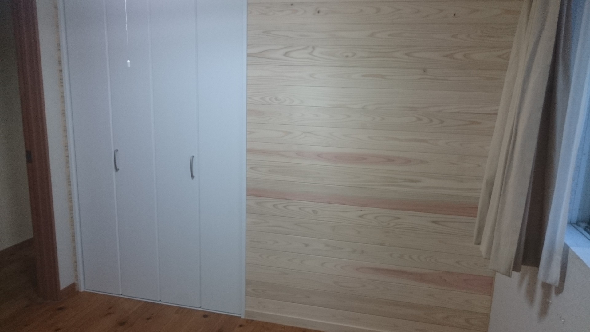 部屋の壁は 贅沢に本物木の板張りにしました。