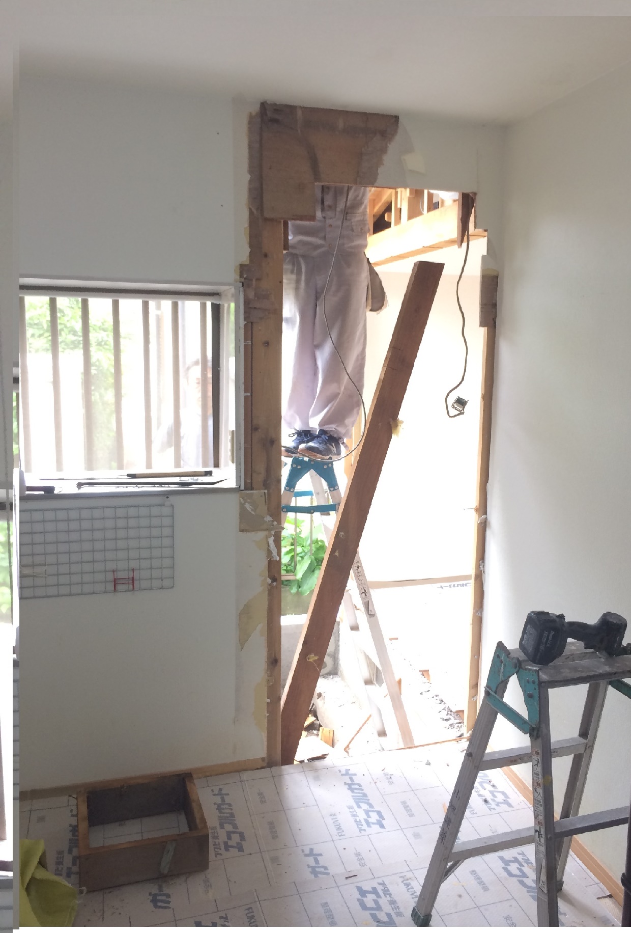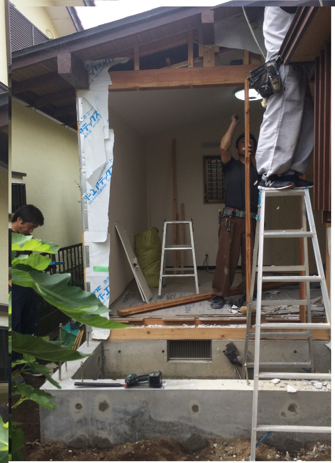 トイレ室 増築工事 2017.6.2 | お知らせ 基礎工事→接合壁の解体→壁下地組と進み雨を何とか凌げるまでいきました。これから既存の外壁材と同じサイディングを張り内部仕上げです。難しいと言えば難しいですが簡単です。雨仕舞だけですかね気を使い頭を使うのは。こんな工事もサンプラスはやれます。